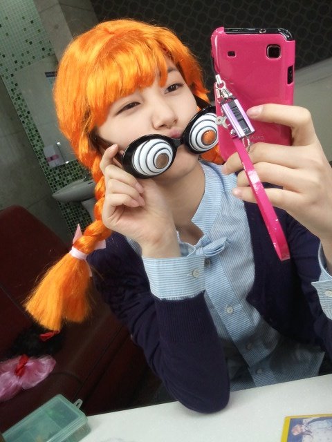 Suzy had an orange wig and and a weird funny shaped glasses showing off a cute face. Suzy had to miss the 2010 Love Sharing Concert to film for the drama.