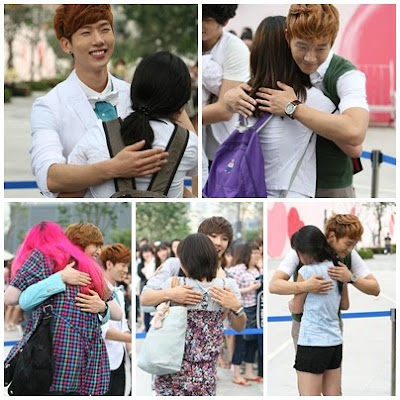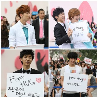 2PM's Chansung, Junho, 2AM's Jokwon, Jung Jinwoon, MBLAQ's G.O, Lee Joon, and C.N Blue's Kang Minhyuk participated in the Free Hug event.