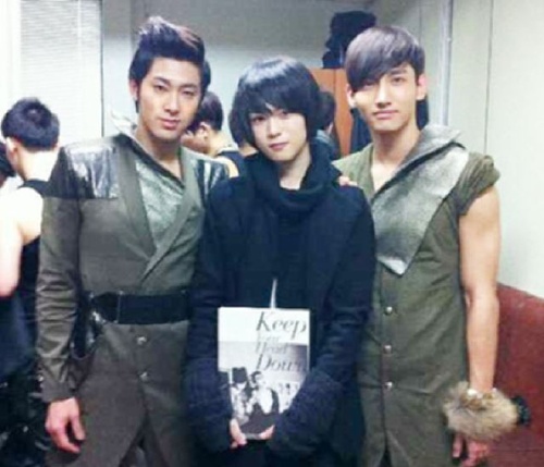 DBSK and Popsicle both performed on KBS 2TV 'Music Bank' that aired on the 14th. This picture seems to have been taken in the waiting room with Karam in between the two DBSK members while holding a copy of 'Why (Keep Your Head Down)' Special album in his hand.