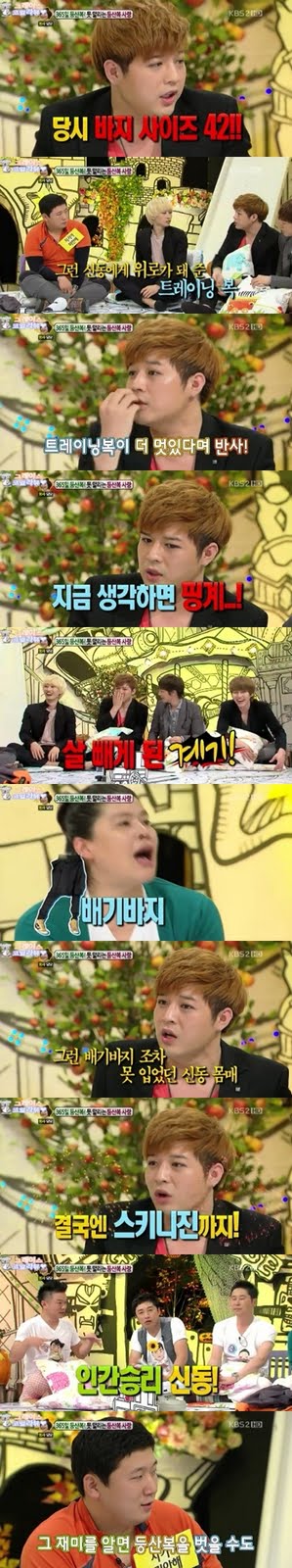 Shindong then expressed his sadness, "Although there was an extra room, my thigh wouldn't fit into it!". Somewhat, baggy pants wouldn't fit Shindong ever.