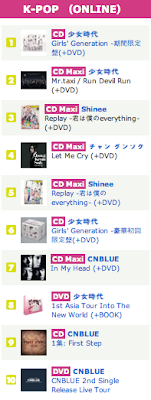 The top ten of, “K-Pop Top 100,” HMV Japan’s special chart for K-Pop releases is dominated by SNSD,SHINee, Jang Geun Suk and CN Blue. SNSD claims four out of the top ten spots, while CN Blue claims three.