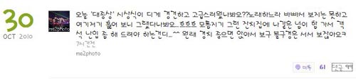 Similarly, PSY has also spoke up regarding this by posting in his Me2day, saying “The awards show today must’ve been really godly and luxurious, hmm? I was too busy singing and wasn’t able to watch it, but it seems like the general sentiment after reading here and there…. They should’ve invited a guy like me so I can trespass into the audience… ^^ You know, people sit down to watch good shows and stand up to watch bad shows.”