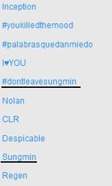 On tonight's list of top ten worldwide trends, 'Sungmin' is trending in last place as of now. The reason for this is he recently shut down his twitter account. No one knows the reason as to why he did so but perhaps another Super Junior member will clarify this on their own twitter accounts soon. To read more about Sungmin's twitter, click here.
