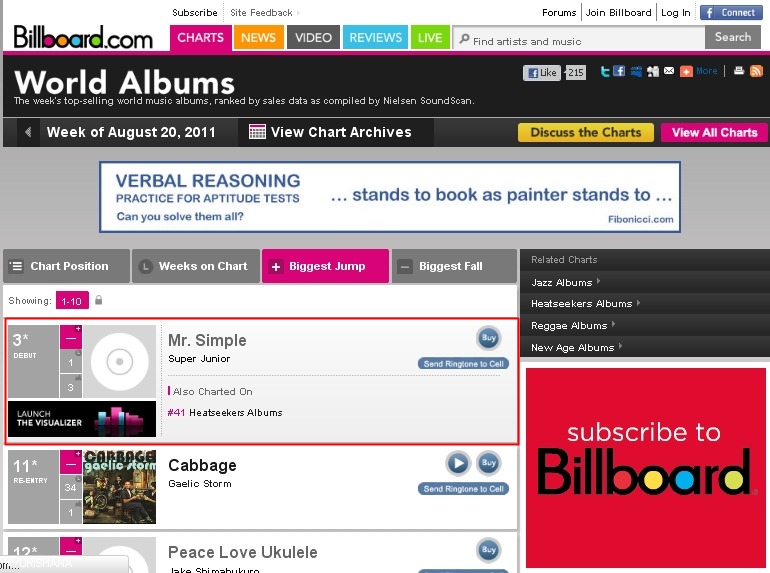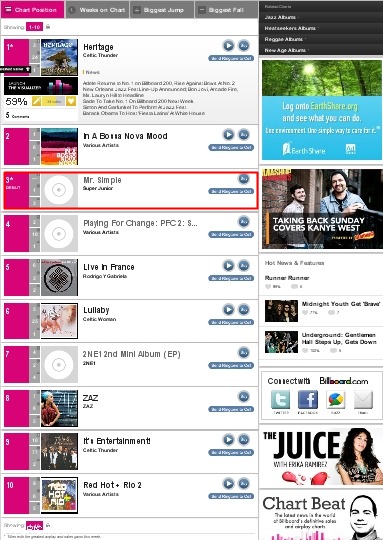 As of today, Super Junior debuted 3rd in Billboard World Album chart.