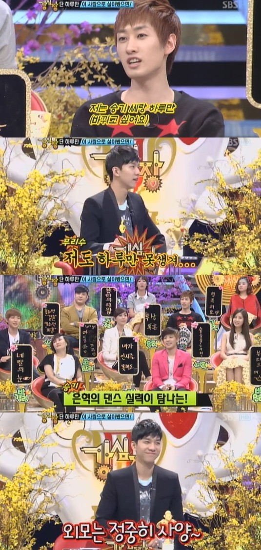 Eunhyuk then chose Lee Seung Gi as the person he would like to trade places with for the same reason as Shindong's, to become ugly for a day.