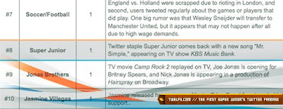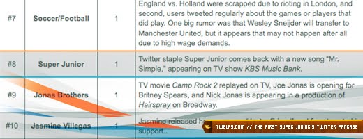 Most of the notable topics that we trended last month were related to their comeback with the 5th album, Mr. Simple. Thanks to all of the amazing twitter E.L.F. out there, we could help promote the album as well as Super Junior for the world to see. Notice how even after months of absence on the top 10 list, Mashable still seems to remember SJ, even calling them ‘Twitter Staple’.