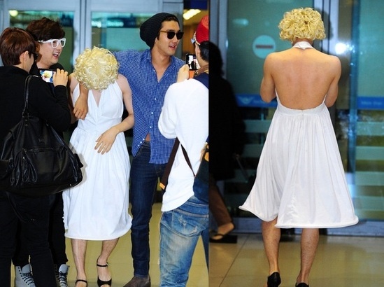 Eunhyuk drew attention as he arrived in Incheon International Airport on April 30 dressed as Marilyn Monroe. The Super Junior member surprised everyone as he sported a curly blond hair, red lips and white dress.