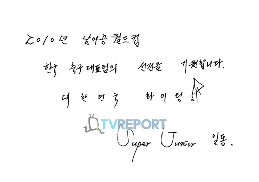 Super Junior's leader Leeteuk said, "2010 World Cup in South Africa is starting soon. The first game is coming up soon and we hope the Taeguk Warriors show us a great game without injury." He also said, "many people want an encore of the legend in 2002 World Cup. However, this is not 2002. We hope they write a new history for 2010."