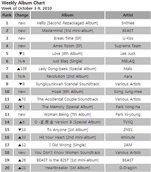 Meanwhile, SHINee’s repackaged second record “Hello” entered the top spot on Gaon’s album chart and other new releases “Mastermind” from BEAST and “Break Time” from U-Kiss placed at No. 2 and 3, respectively, during the second week of October.