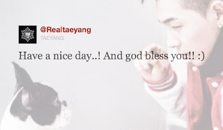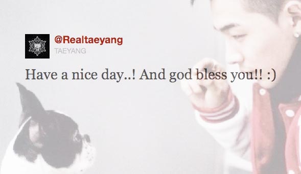 [NEWS] Taeyang's Twitter Update, "Have A Nice Day" Big BangJannicaOct 09, 2011 Share 0 comments C:BIGBANGUPDATES Tags: Big bang, News, Taeyang, Twitter Share Previous articleNext article Leave a comment Name Email Content Post comment