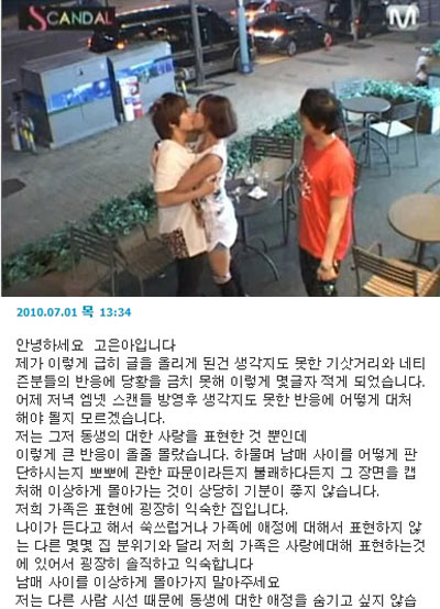 But Go Eunah replied "I did that to express my love for my younger brother" and "How our sibling relationship is being judged, the kiss that's caused a stir, or the discomfort, or the true capture that makes it seem weird without grounds is giving me a pretty bad feeling".