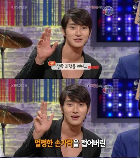 On KBS 2TV’s ‘Seung Seung Jang Gu’ aired on June 22nd, Siwon was asked 'What is your three fingers trademark gesture all about?' Siwon answered 'It was before Super Junior debuted, when I went to Hong Kong to film and promote for a movie. We had to pose for the reporters to take photos when we introduce ourselves. But because I was young I felt very pressured and didn’t have that much confidence, so when I raise my hands to greet them my ring finger and pinky just didn’t come up properly.'