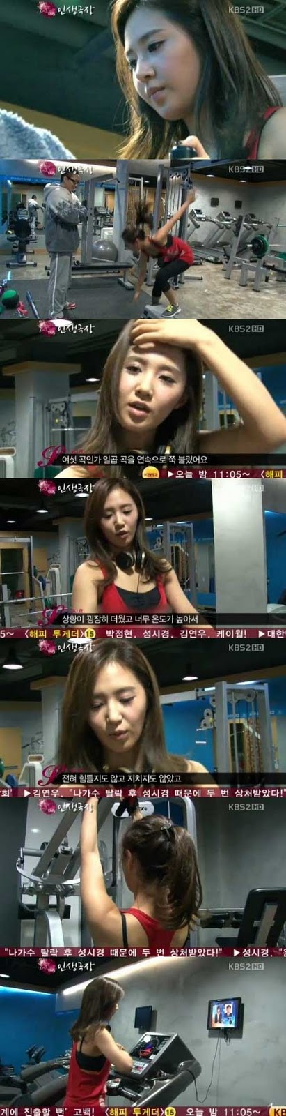 Yuri, who is known for her workout regimen, including her habit of doing 600 sit-ups every day, once again had her physical training featured, this time on KBS2′s “Star Life Theater” on November 24th. A member of the gym Girls Fitness, Yuri was shown going there after hours due to her schedule. She commented that during Girls’ Generation’s Japan Arena Tour over the summer, breathing inside the hot venues was difficult, but she was able to handle it because of her training.