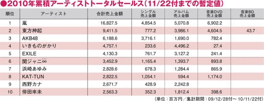 According to the ’2010 Artistes’ Total Sales Ranking’ (tallied up till November 22nd), released by Oricon Biz Online on the 6th, TVXQ ranked second behind popular Japanese group Arashi. By ranking higher than Japan’s representative groups such as AKB48, Ikimono-gakari, EXILE, Kat-tun and Koda Kumi, TVXQ maintained their pride as the only Korean group amongst the groups.
