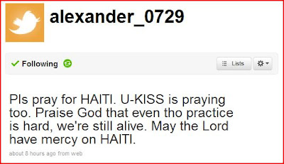 U-Kiss' Alexander urged everyone to pray for Haiti,Wonder Girls Sun Ye also urged people to send love to Haiti,hope that the situation will turn positive soon,let's pray for them too!