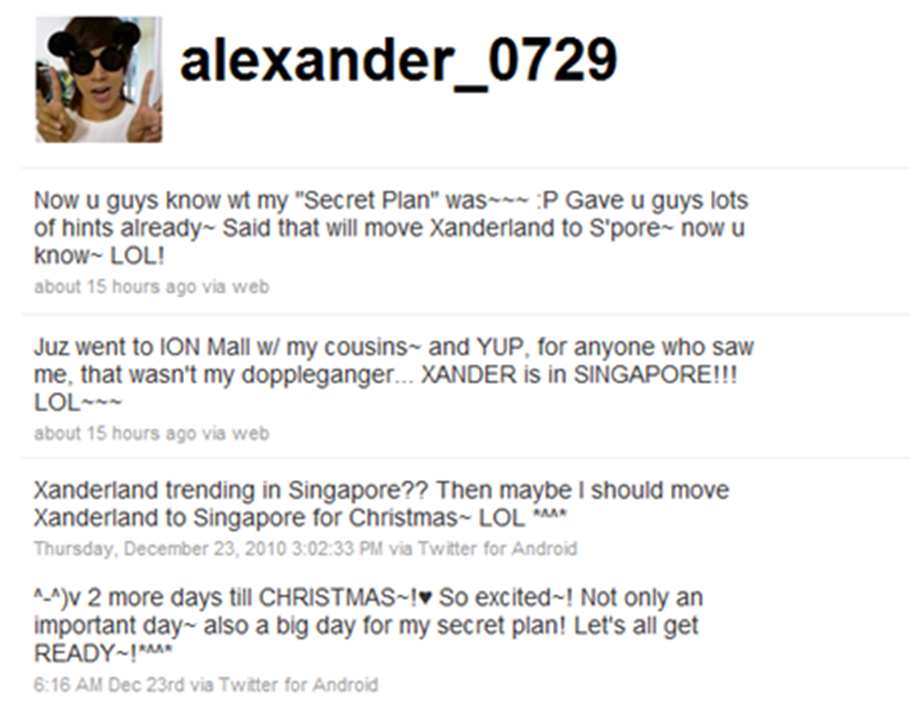 On 23rd Dec, Alexander posted on Twitter about having a secret plan on Christmas. He also gave hints saying "Xanderland trending in Singapore?? Then maybe I should move Xanderland to Singapore for Christmas~ LOL".