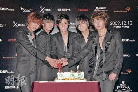 [on.cc Special News] Korea Boy Group SS501 arrived in Hong Kong this afternoon for preparation of this saturday's concert. 5 of them use Cantonese make their self introduction. The organizer presented a cake to pre-celebrate their success to the concert. 5 of them couldn't resist the temptation to try the cream. According to Kim Hyun Joong, they will rehearse for their concert tomorrow and hoping to perform in the best condition.