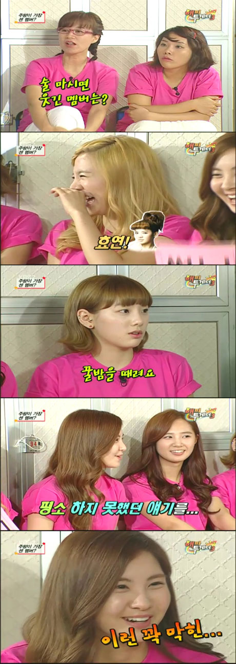 On Happy Together aired on the 11th, TaeYeon, Yuri, SeoHyun, Sunny and SooYoung voted Sunny as being able to drink the most and voted HyoYeon for being the most weird when drinking.