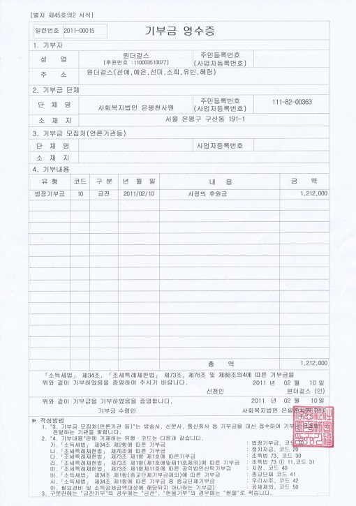 To celebrate their 4th Anniversary, Wonder Girls’ fan club WonderFul wanted to make it even more special for them. Hence, they made a donation of 1,212,000₩ (USD $1,078) to EunPyeong CheonSaWon (Angel’s Haven Orphanage) under the name of “Wonder Girls (Sunye, Yeeun, Sunmi, Sohee, Yubin, Hyelim)“. An orphanage which the Wonder Girls themselves have been to volunteer at before. A certificate has also been issued by the orphanage to recognize the donation made under the name of Wonder Girls.