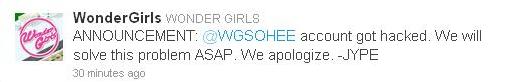 Sohee's twitter account got hacked according to Wonder Girls's Twitter account.