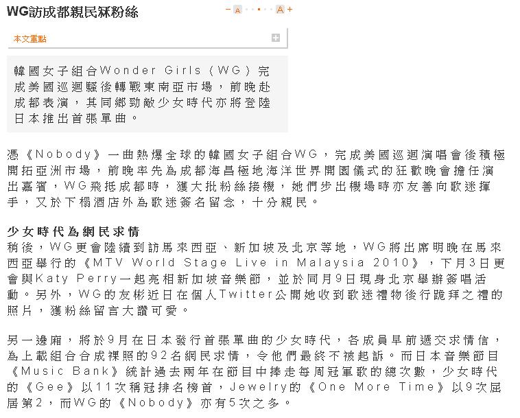 Korean girl group WONDERGIRLS (WG) completed their American tour & has switched their attention to the Southeast Asian market. They performed in Chengdu a couple of nights ago, even as their fellow rivals SNSD heads to Japan to launch their first single [there].