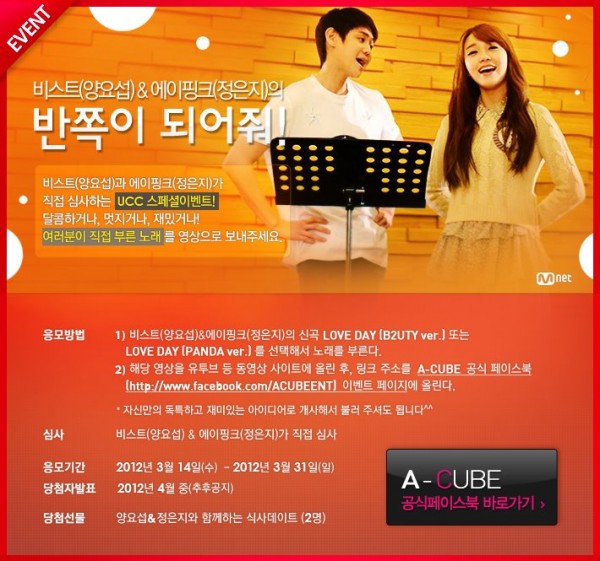Fans can fill in the missing sections to create a duet with their favorite singer, and upload it on streaming sites such as Youtube and provide the link to A-Cube’s official Facebook page. Applications will be accepted for about 15 days from March 14 to 31. Yoseob and Eunji will personally judge the videos and the top 2 winners will win a dinner date with Yoseob & Eunji.