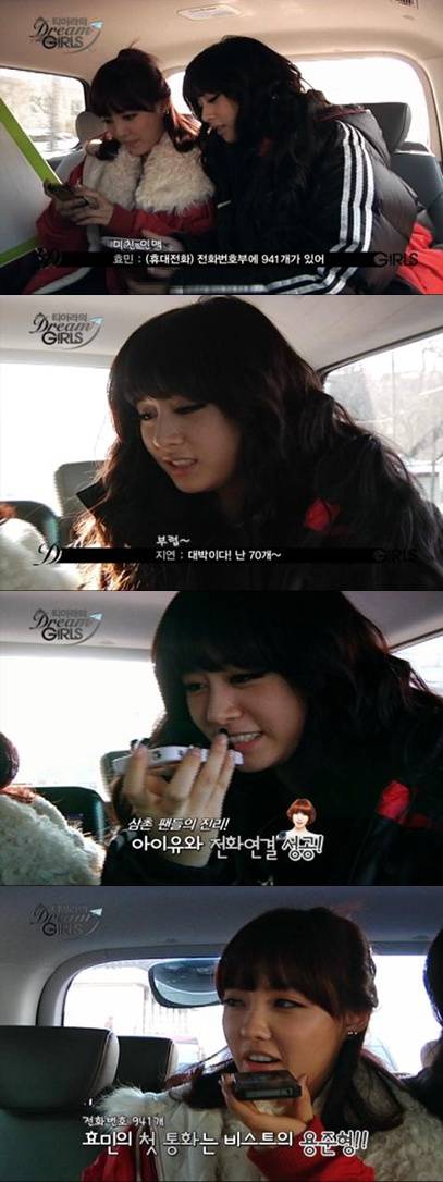 While calling her friends, Hyomin revealed "I have over 941 contacts in my cellphone. Among them, Kara, Beast and other idols. But also respected senior like Hwang Jungmin and Song Euni". Jiyeon looked with envy to Hyomin declared "I'm jealous I only have 70 contacts."