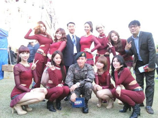 In the photo, Super Junior Leeteuk, the MC for the K-Force Special Show, was surrounded by the pretty girls from Nine Muses. He looks cool on his army uniform.