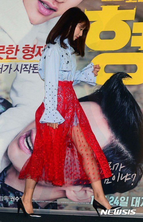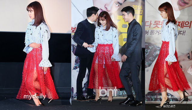 Apparently, Shin Hye catches attention with her unconventional fashion during the photowall. Shin Hye appears before the media in oversized polo dress with only a red laced skirt covering her legs.