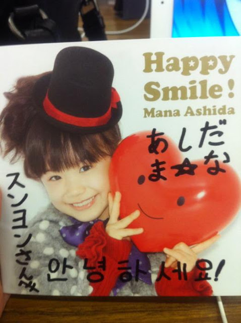 On November 25th, KARA member Seungyeon shared a proof shot of the gift she received from the actress. She uploaded a photo on her Twitter and wrote, "A picture from some time ago! Didn’t post before, right? Thump, thump. Today, Ashida Mana gave a gift with such pretty writings."