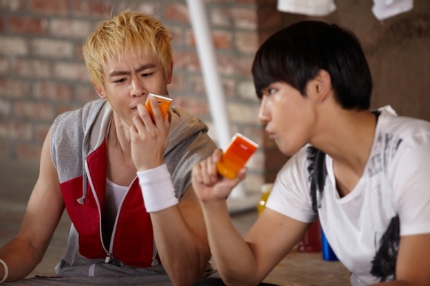 The boys were photographed examining and playing with their colorful phones on the set of what looks to be filming for an upcoming CF. They seem to be at eased and relaxed -- check out the photos below!