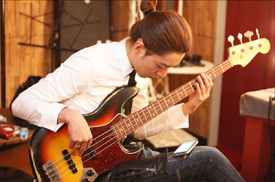 Bassist Lee Jungshin plays bass to relieve his boredom during filming.