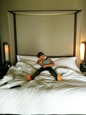 Who says only 2PM is the hottest time of day? 2AM's leader Jo Kwon graces us with a tweet showing us his hotel room, and especially how big and luxurious the bed is. Wearing shades, inside? Very pimpin. Is anyone else noticing where his hand is?