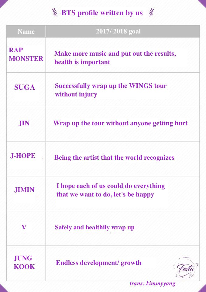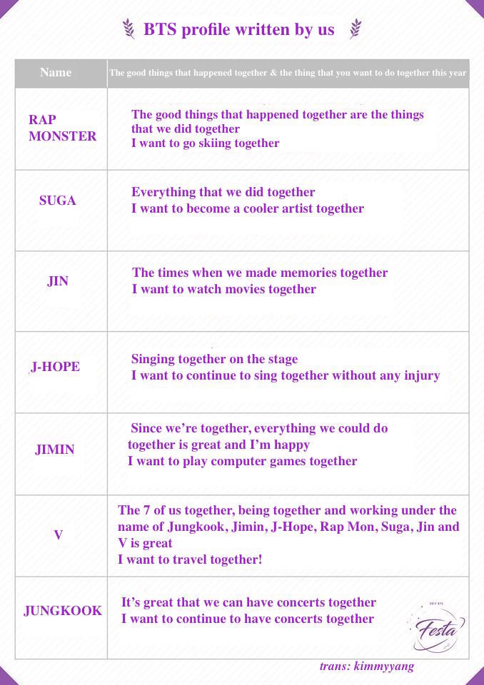 [Picture] [#2017BTSFESTA] BTS profile written by us [170605] 2017btsdiaryJun 04, 2017 Share 0 comments ENG.TRANS : Credits : BTS OFFICIAL FACEBOOK Eng Trans : Kimmyyang Tags: 2017, Bts, Btsfesta, Facebook, Picture, Trans eng Share Previous articleNext article Leave a comment Name Email Content Post comment