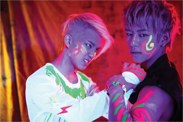 Having the same concept as the previously released teasers, the new photo features Youngjae and Daehyun wearing new hairstyles and colorful neon body paints in a bright red backdrop.