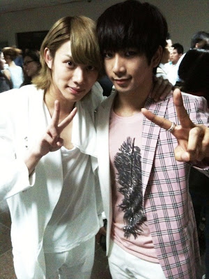 Twitter King Heechul just fresh from Music Bank has shared with us a picture of him and GO of MBLAQ hanging out with peace signs backstage in Music Bank.