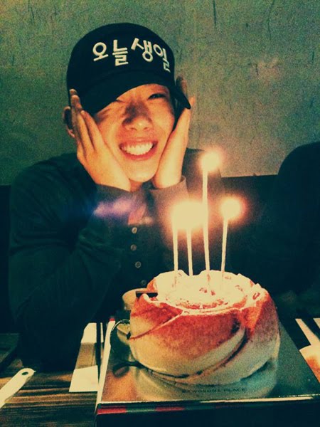 In the picture above, Jo Kwon was seen wearing a hat with words of 'My birthday today'.He was smilling when he posed with his birthday cake !