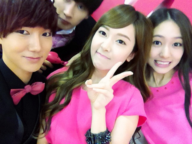 He is seen posing with Eunhyuk,SNSD's Jessica and f(x)'s Krystal in the photos above.