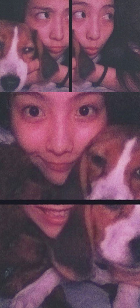 She poses in bare face with her pet dog on the bed,she looks pretty without much make-up,agree?
