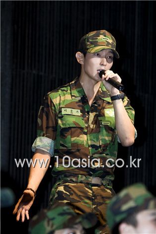 Actor Lee Joon-ki, part of the cast of military musical "Voyage of Life", salutes at a press conference for the show held at Dongsoong Art Hall in Seoul, South Korea on August 2, 2010.