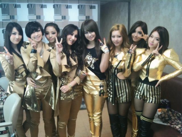It is great to see the girls wearing gold outfits at the same time,they are so shiny here.Judging from the outfits they wear,this photo must be taken at the backstage of Music Bank!