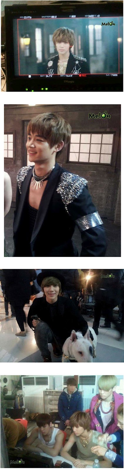 On the photo you can see Taemin and Minho both wearing black outfits and also at one point Taemin poses with a dog. Also, Taemin, Key and Jonghyun watching their music video monitoring their progress. You can see Key's bright hair and Jonghyun's toned arm muscles. Excited yet?