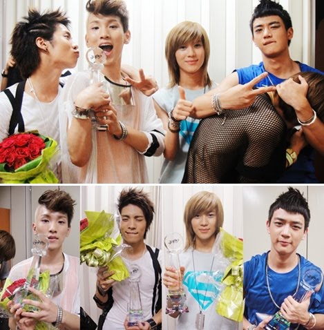 In the picture above, Leader, Onew was seen crying in Min Ho's arm.Each of the members holding the trophy expressed their happy expression.Fans responded with ' Don't Cry Onew ! ' and there were comments of congratulations .