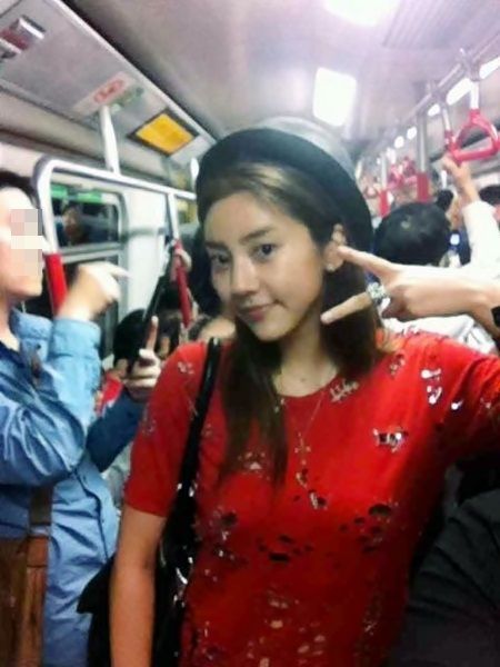 She garnered much attention with her red outfits with holes on it,she shows the V sign and carves an angelic smile.