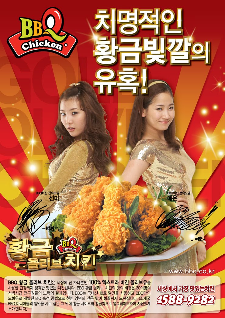 Wonder Girls BBQ CF chicken posters released!!! I dont know whether to look at the crispy fried chicken or to the pretty wonder girls. Those chicken's sure made me hungry~ While the wonder girls are preparing for their concert in China, they made sure not to let Korea behind and with CF's here and there, it sure pleases wonderful's while waiting for the comeback of their beloved wonder girls.