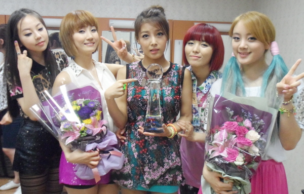 Wonder Girls claimed their first victory for their new song Like This on Music Bank yesterday and the girls posed happily at the backstage with their hoobaes JJ Project.