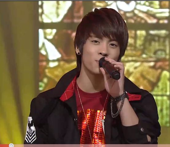 This unisex cut cranberry colored t-shirt (100% cotton ) which decorated with orange - copper foil topped off with mettalic red-foil, that SHINee Jonghyun wore on Hello Goodbye stage 30 october 2010 prized $101. As we know, Jonghyun and Key are likely wear something's different and of course looks good on them. So, they shared this beautiful tee together. We could see on, pictures below. Key wore this not only on stage but also when they practiced together with f(x).