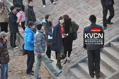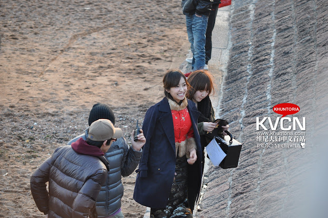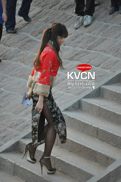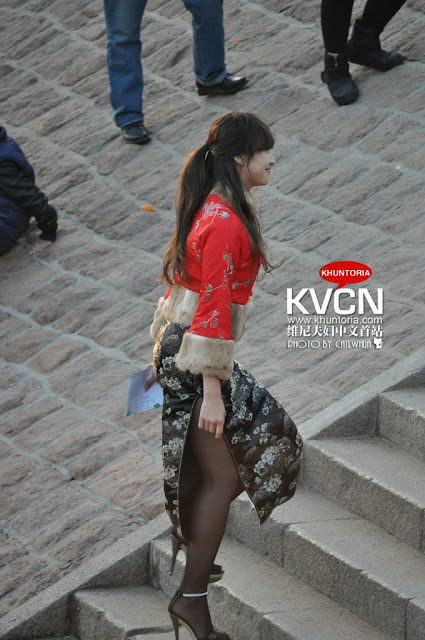f(x)'s leader Victoria was spotted wearing traditional chinese dress when she was shooting in Qingdao.