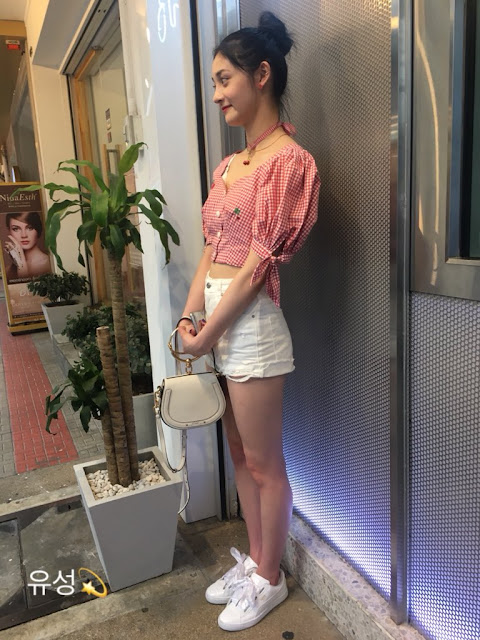 Fans share some photos of Kyulykung in real life. The photos are not photoshopped. Kyulkyung is seen posing outside of a shop in the photos.