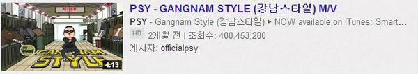 On the same day, Psy celebrated by tweeting, “Gangnam Style 400,000,000 views on Youtube!!!!” and attached a screen shot from Youtube, showing the actual number of views.